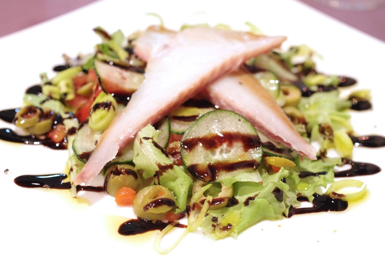 前菜は、スモークしたタイのサラダ。