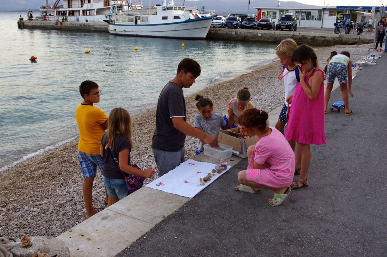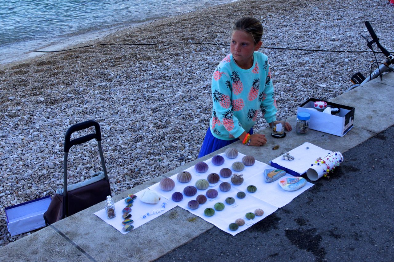 港沿いで貝殻やブレスレットを売る子供たちの姿。