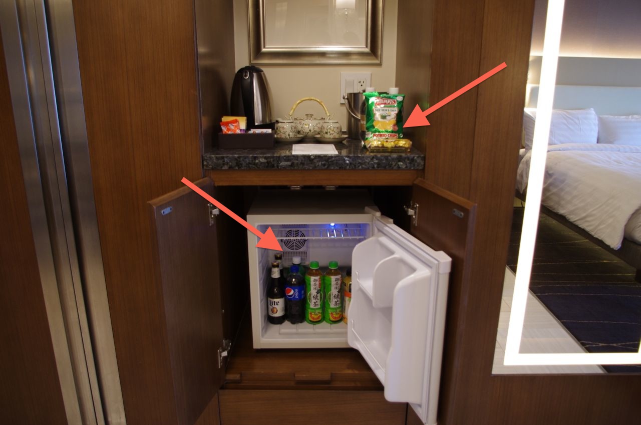 冷蔵庫のドリンクとお菓子3つ(チョコ、ウエハース、チップス)は