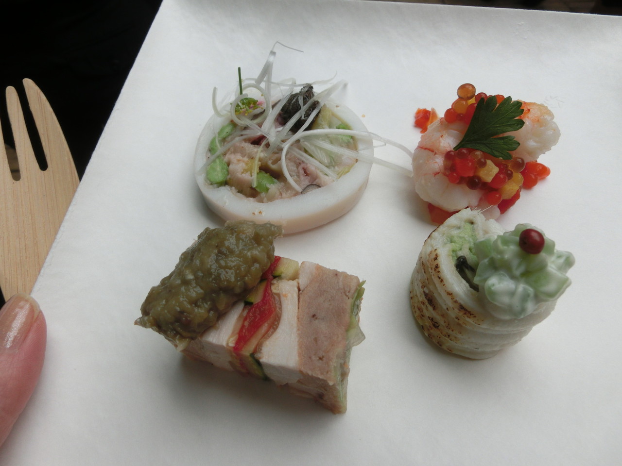 デザートもしっかりいただきました。 代官山の「ル・プティ・ブドン」の「仔羊のパイ包み焼き」などの温かいお料理と、「アスパラガスのシブースト」などのデザートです。
