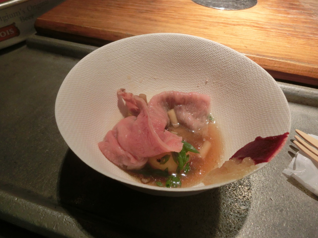 こちらは、麻布十番の「リベルテ・ア・ターブル・ドゥ・タケダ」のお料理「鳥取県山和牛とそのコンソメ」。 お肉が信じられないほど柔らかく、添えられた酸味のあるコンフィが美味しかったです。