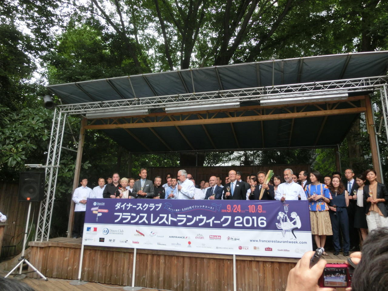 プレス発表会の後は、庭園でレセプションが開催されました。 フランス大使のご挨拶の後、乾杯です。