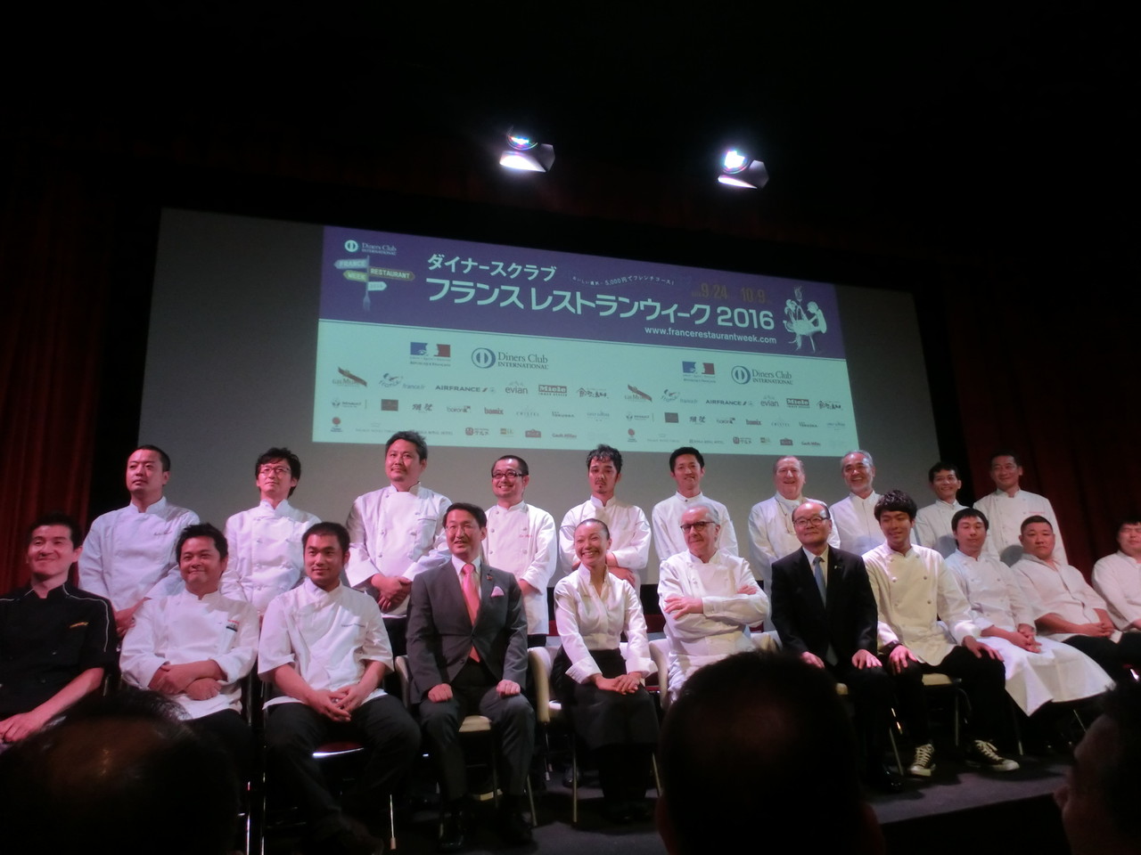 前列中心が、かのアラン・デュカス氏。 デュカス氏の周りに座ってらっしゃる方々の多くは、全国の若手シェフの皆様です。 フランス レストランウィークのコンセプトの一つが 『フランス料理のノウハウの継承=若手シェフのプロモーション』。 ですので、レストランウィークでは、デュカス氏やパッション氏が弟子(=ディシーブル)を推薦し、ディシーブル達には活躍の場が提供されるとのことでした。