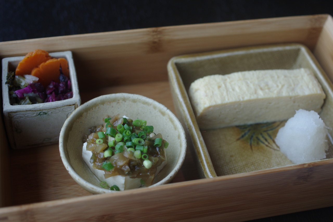 卵焼き、お漬物、お豆腐。お豆腐の上は、ネギとオクラとザーサイがのっていました。