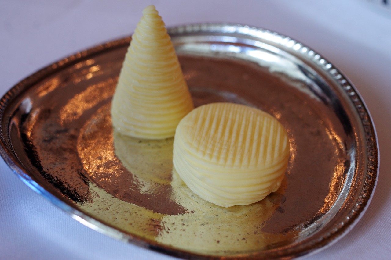 バターはボルディエかな?有塩・無塩とあります。リーンなパンにミルキーで濃厚なバターがたまりません。バターをチーズのように盛って食べるのが好き。(ただし美味しいバターのみ) シャンパン(もしくはワイン)、バター、パンがお揃うと、もうこれだけでいいかなっていつも思ってしまうんです。でもその後の、前菜、メインも