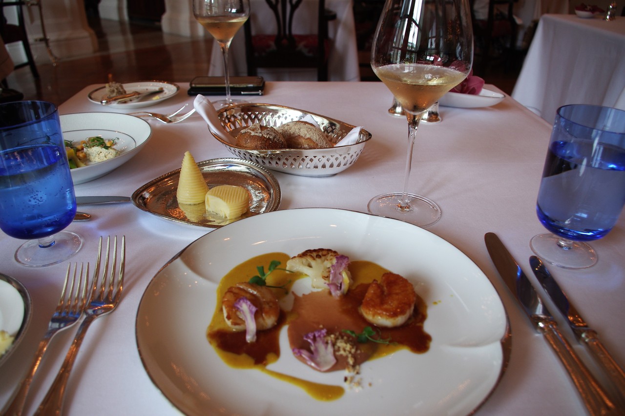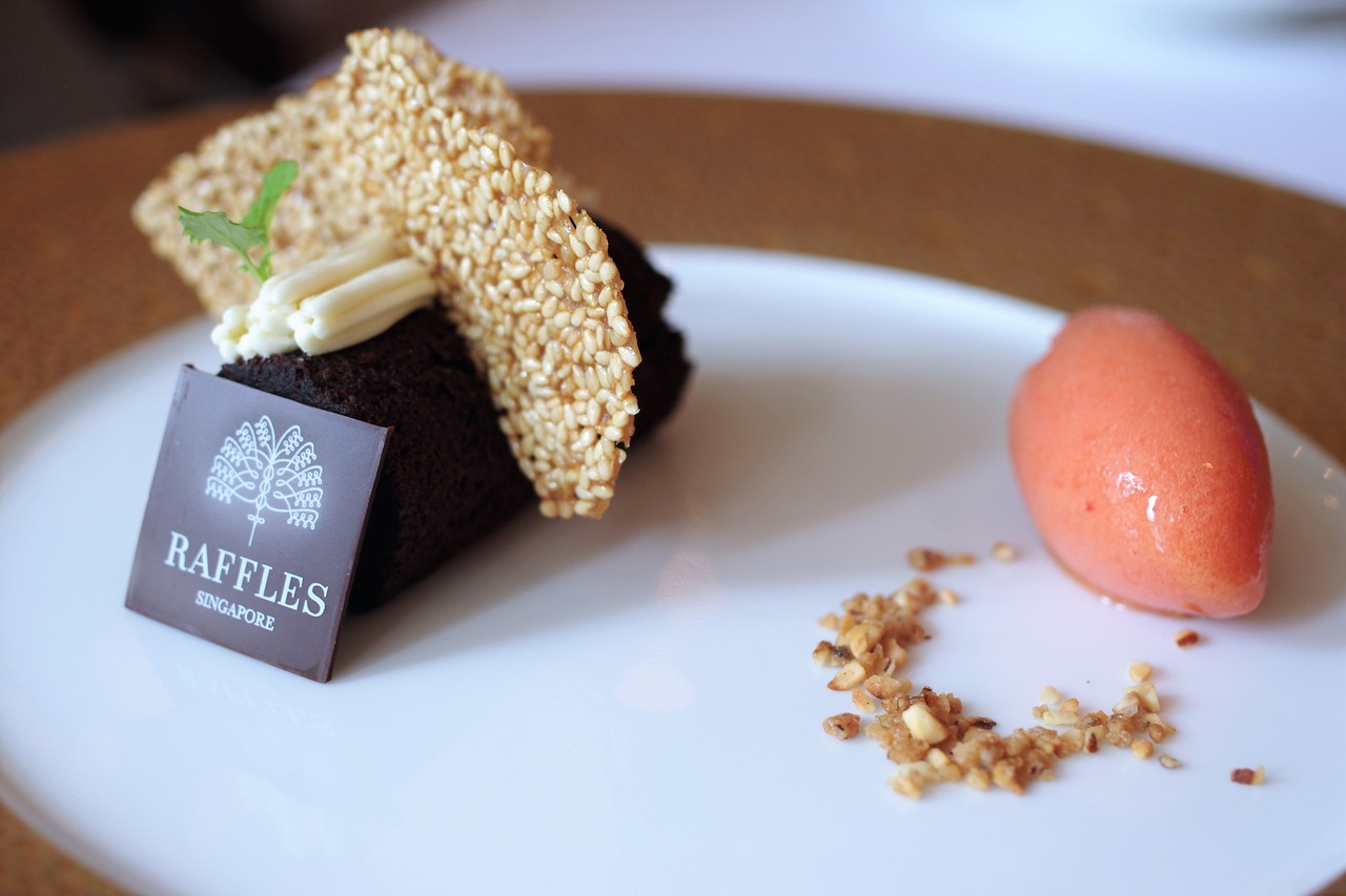 モダンフレンチに、アジアのテイストを織り交ぜたお料理です。 シャンパンは、ビルカール・サルモン。ボトルには、ラッフルズホテルのロゴが入っていて、ギフトショップにも売っています。中身は、特別なもの?かどうかは不明。