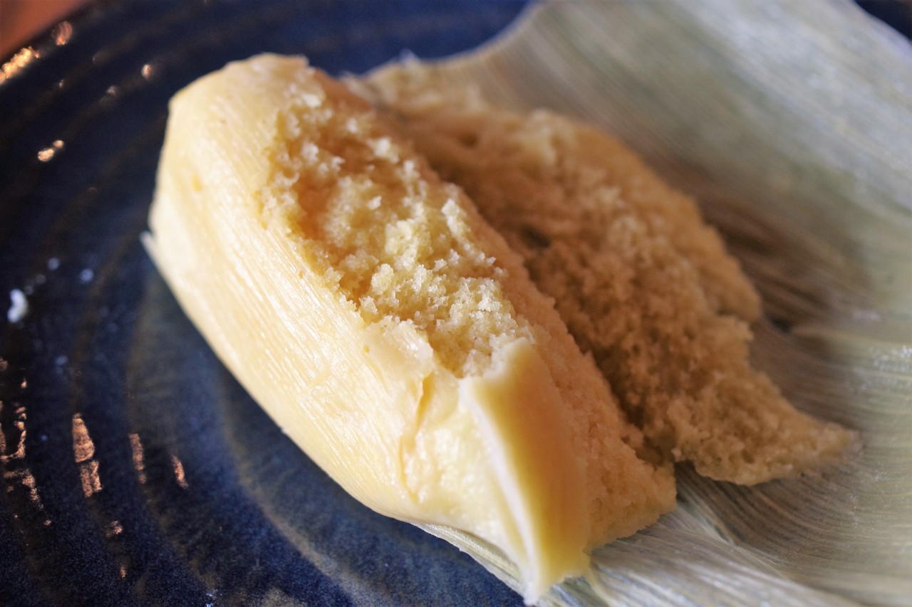 お米とモチ米の粉でつくった生地に甘い餡を包んで、コーンの形に似せて蒸かしたもの。 もっちりというより、ねっちょり?という感じ。 ややピンボケしたようなお味といいますか、たまたま私がとったものが水っぽかったのかも。