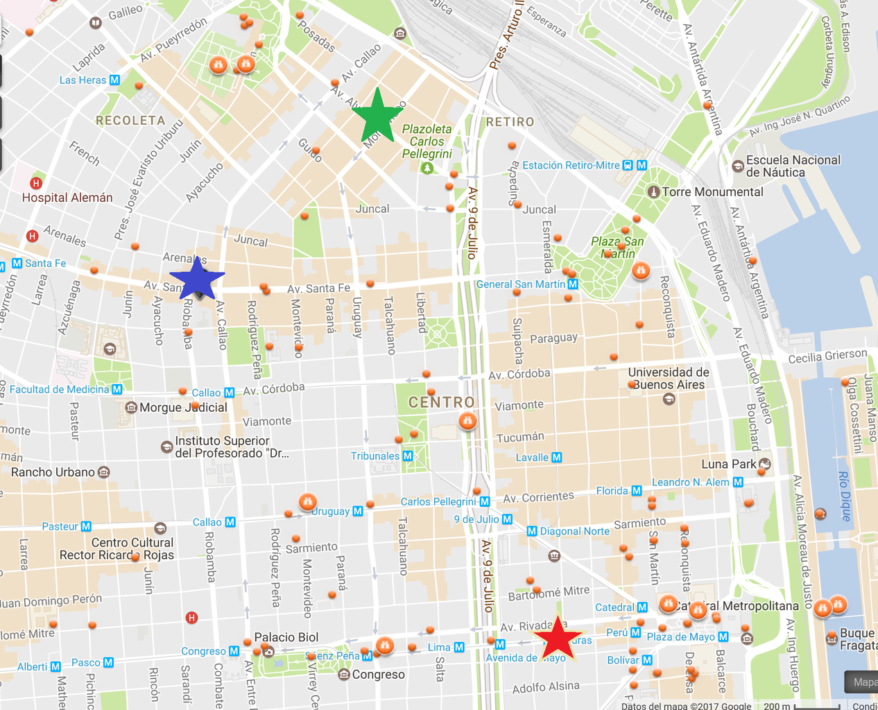緑印がパークハイアット、赤印が先日ご紹介したカフェ・トルトーニ、そして青印がこの本屋さん「エル・アテネオ」です。赤印から青印まで歩きました。けっこう適当に歩いたんですけど(地図を取り出すと、観光客だと思われるから出さないようにしていた。めちゃめちゃビビっています)、得意の嗅覚で辿り着きました。でも、改めて見てみると、え・・けっこう遠い?地下鉄で言うと5駅くらいあるのかな。