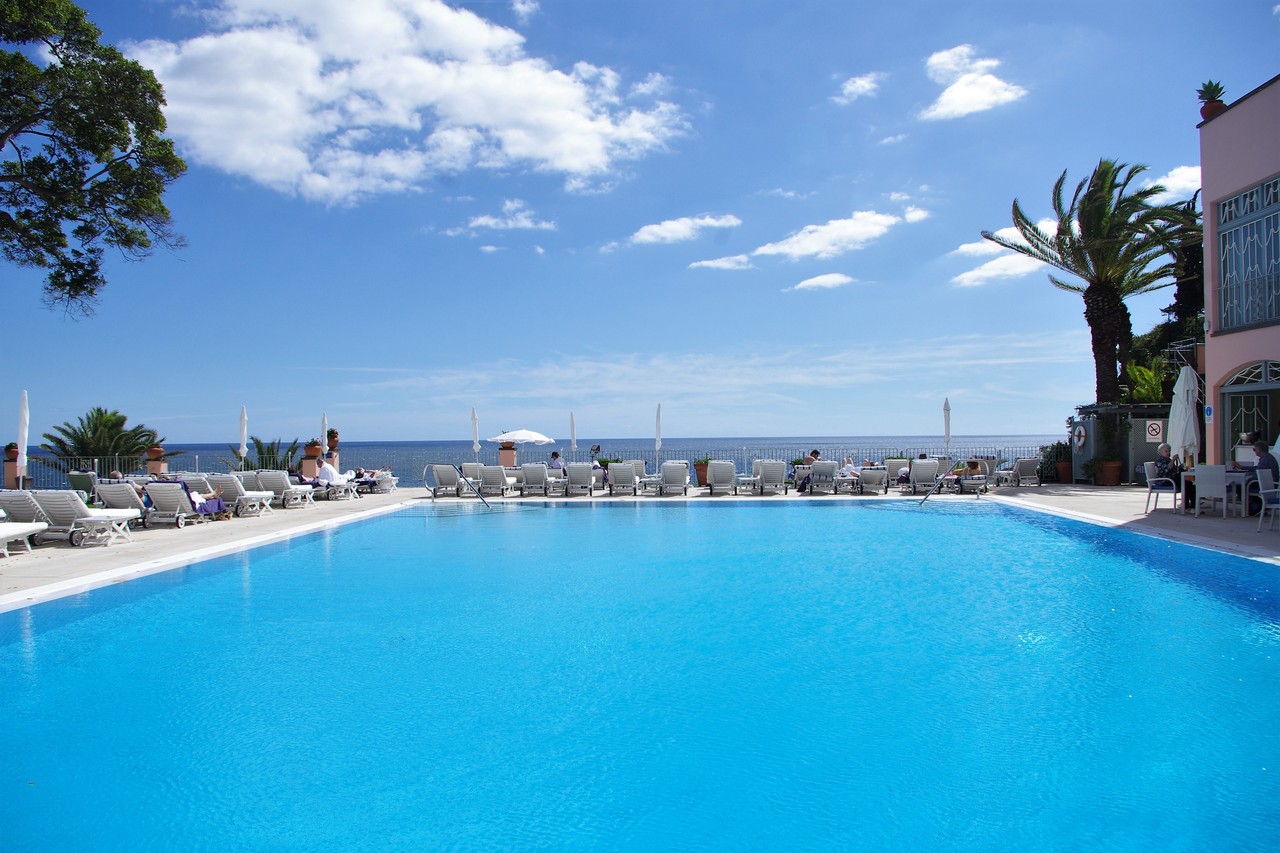 さて、ホテルのプールはこんな感じ。泳いでいる人よりも、海を眺めながらプール沿いでワインを