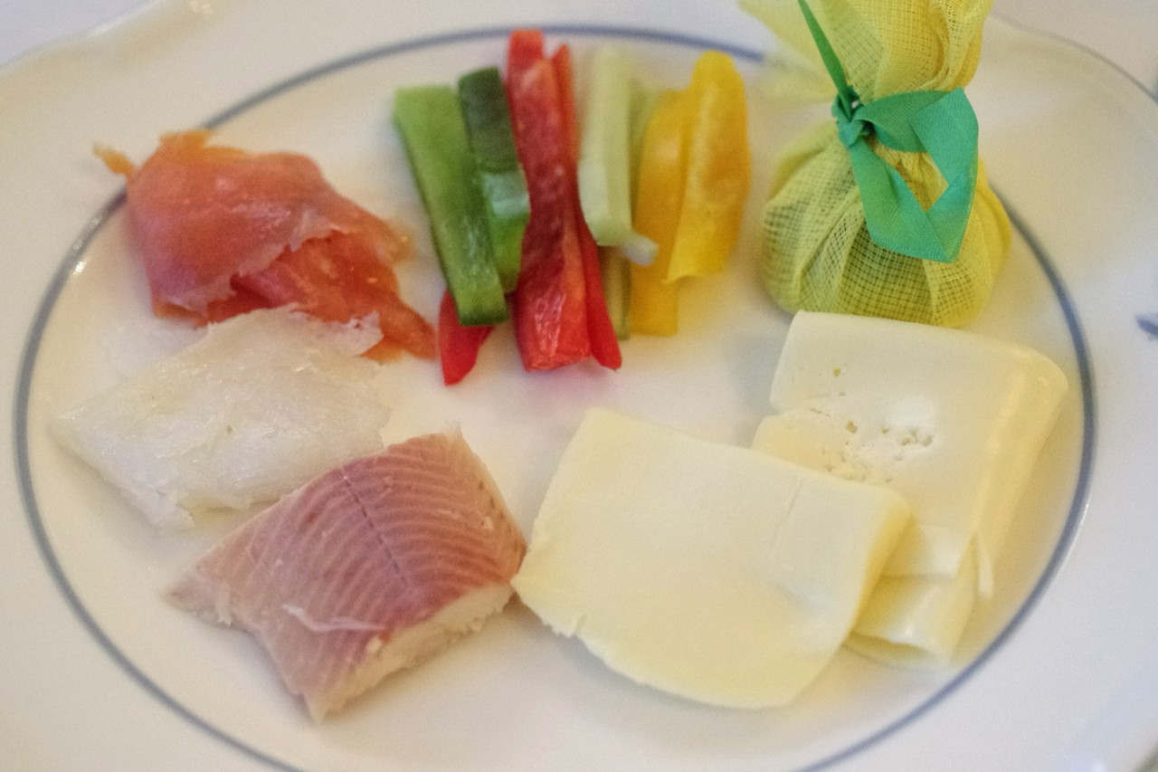 ハムとお魚の燻製、お野菜類はスティックサラダがすこしだけ。