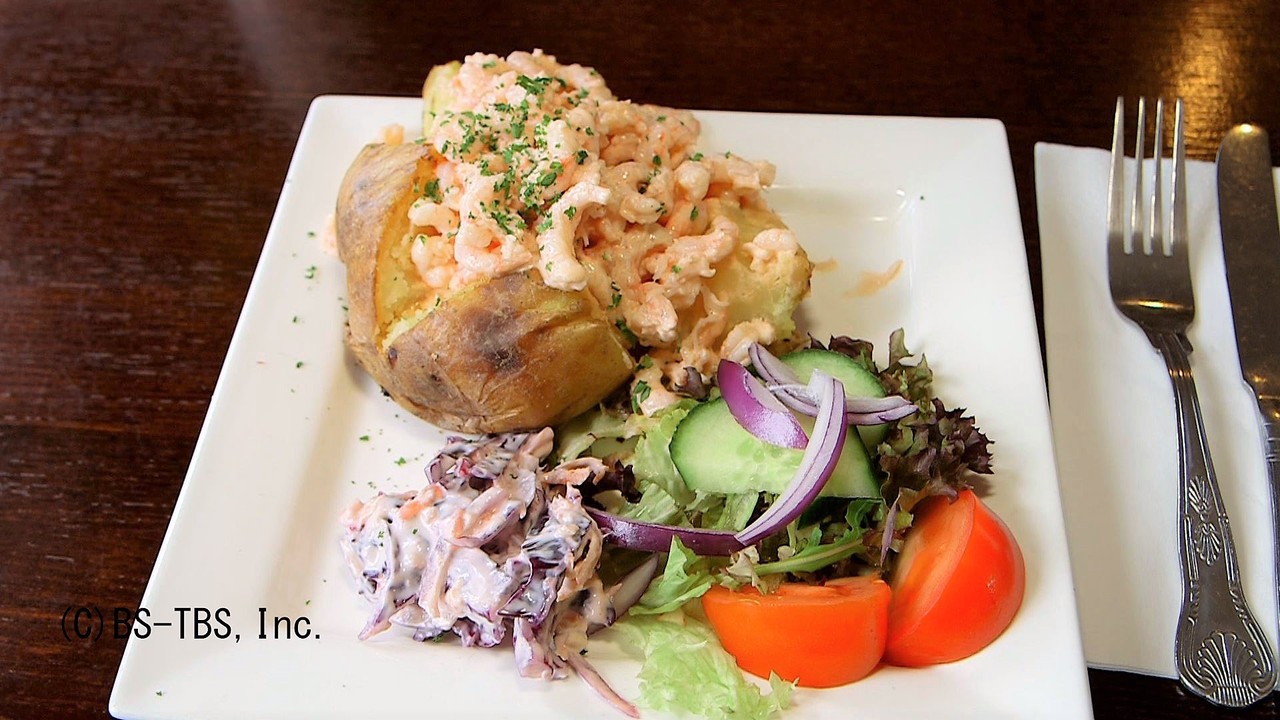 イギリスでも家庭料理は美味しいです。こちらは、ジャケット・ポテト。皮付きのポテトがジャケットを着たように見えることから名付けられた伝統的な家庭料理の一つ。 →ヒースローのBAラウンジで時々いただきますが、そういえば本格的なものっていただいたことがないですね。
