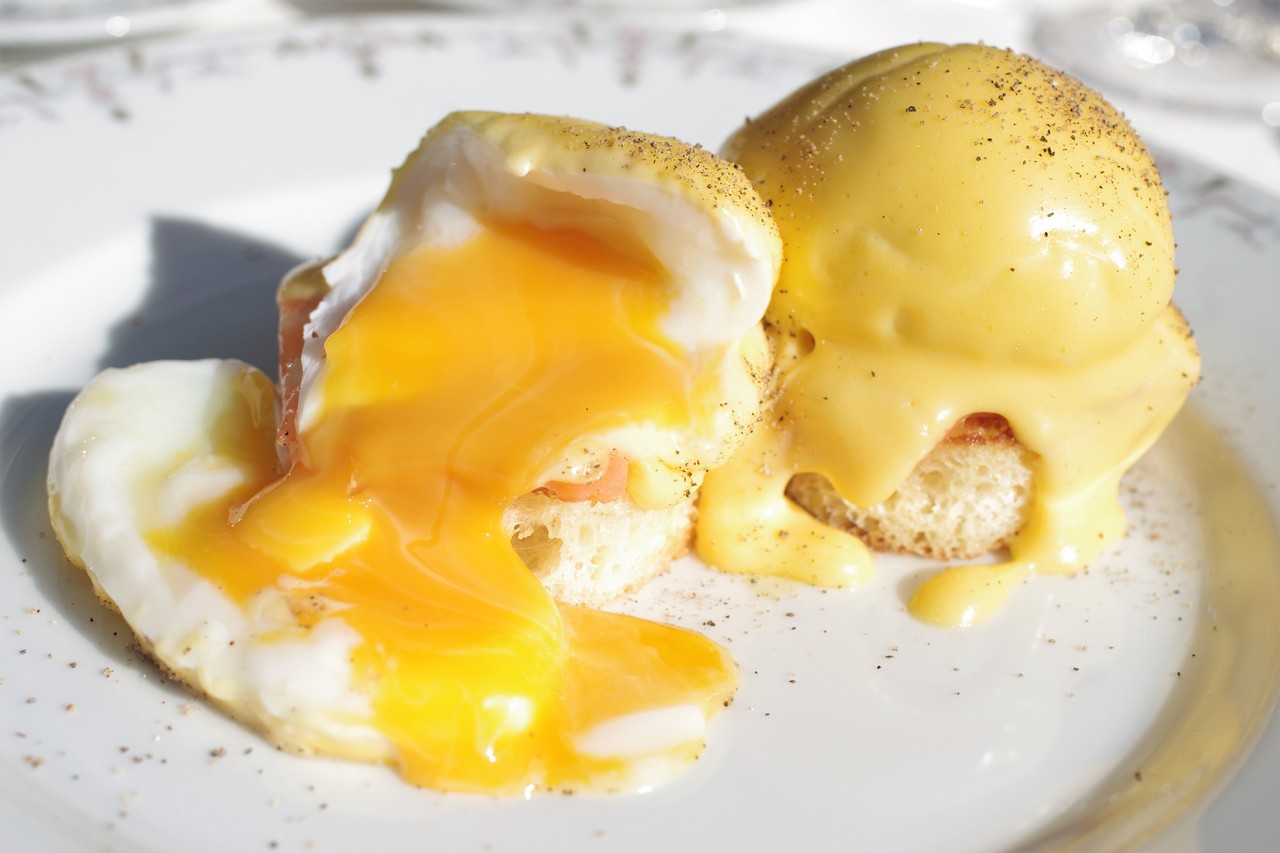 ヨーグルトとフルーツが食べ終わったところで、エッグベネディクトが登場。ちょっと中央からずれている加減がなんとも胸キュンです。