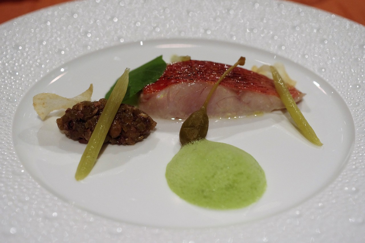 金目鯛×タプナード。フランス、プロバンス地方の伝統的なペーストですが、通常はオリーブ×アンチョビが多いけれど、ここではもろみ味噌が利用されています。これがとっても美味しかったです。