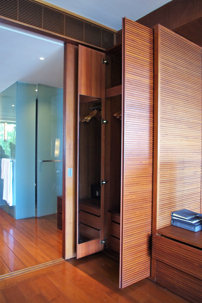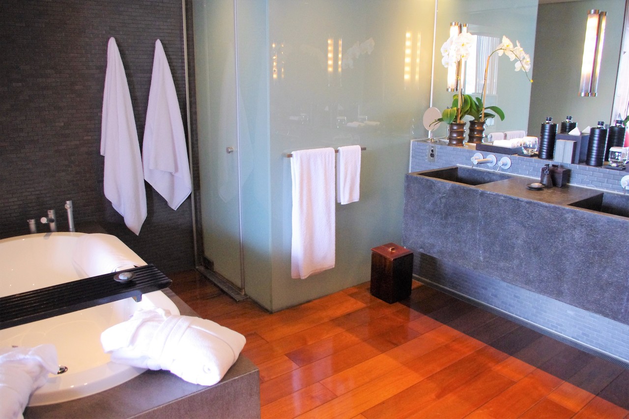 続いてベッドルームです。リビングルーム半分、ベッドルーム+バスルーム半分という感じで2等分されています。リビングルームが広い分、バスルームはやや狭めでしょうか。でもここは、スパの大浴場が充実しているので、お風呂はそちらに行かれる方が多そうです。