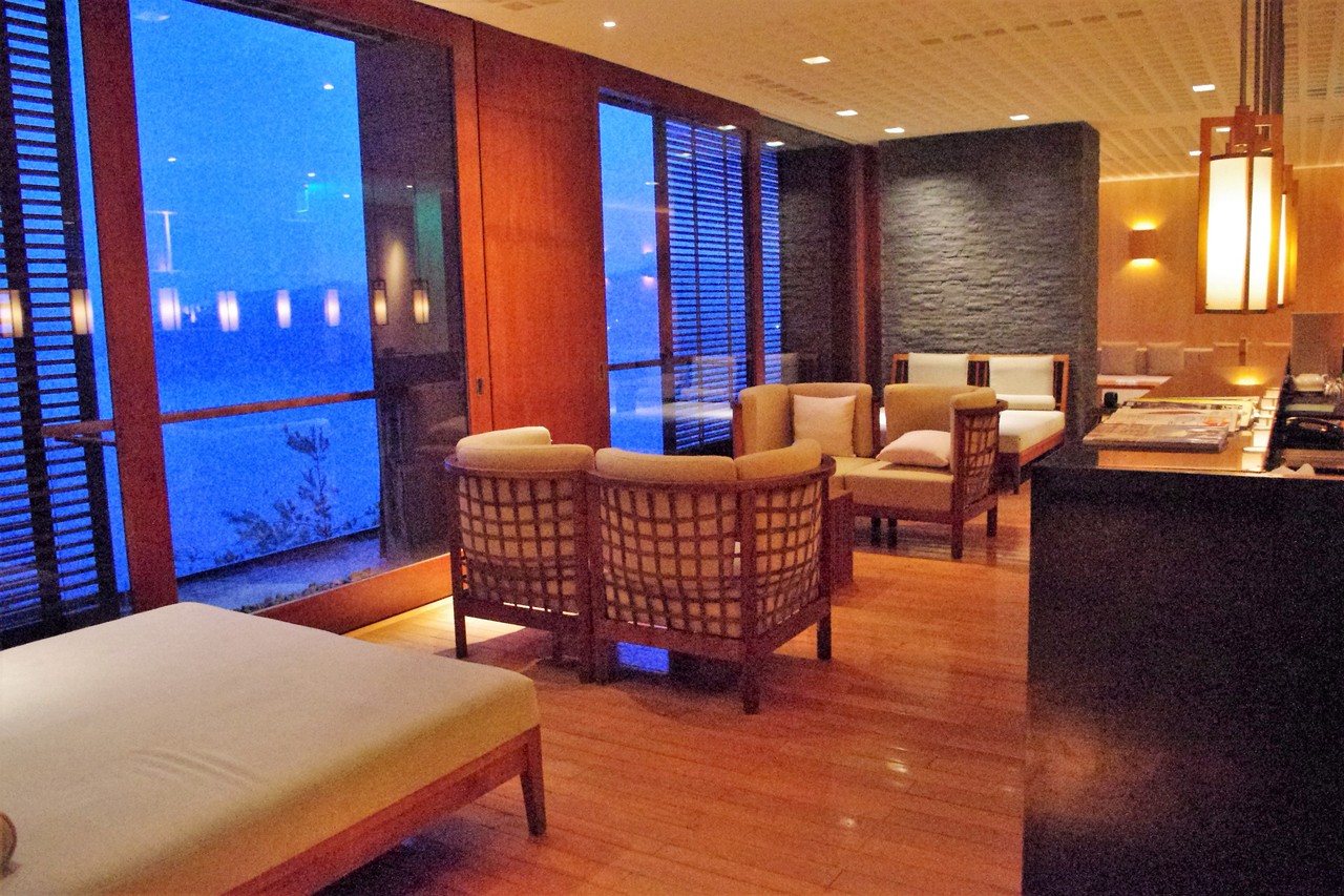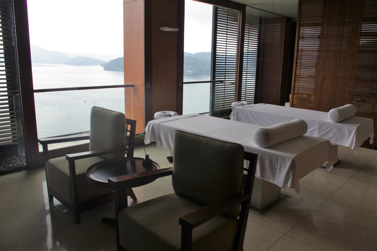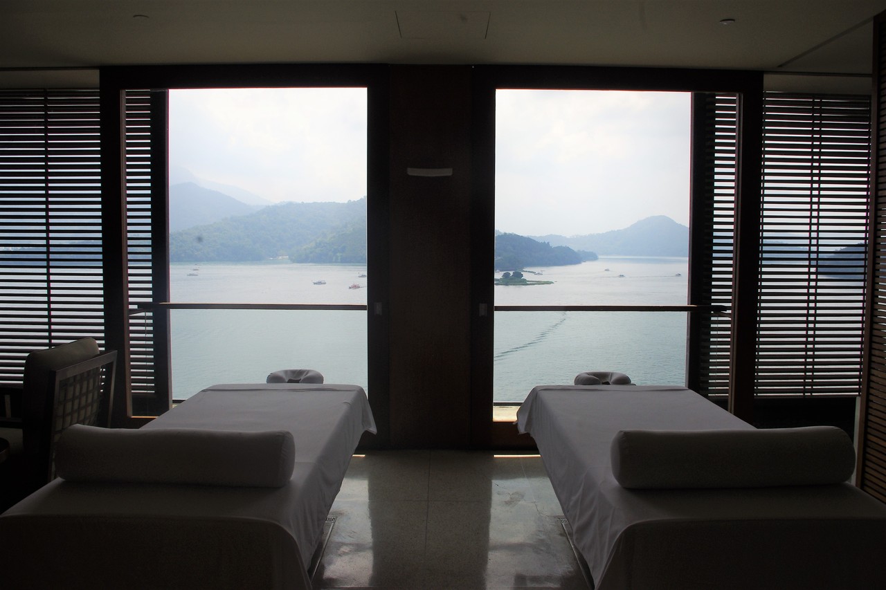 こちらがリラクゼーションルーム。日中は、リーユエタンを眺めることができます。私が滞在したお部屋は、ちょうどスパがある場所の下の階(5階)でしたので、同じビューでした。