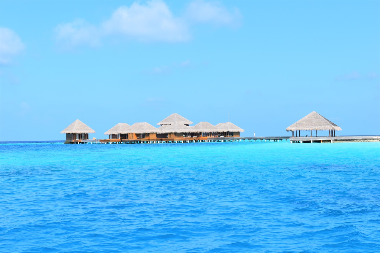 フヴァフェンフシが見えてきました! 空港からですと、一番初めに見えてくるのは、こちらのスパ施設になります。一番左にあるバンガローの中が、ずっと憧れていた世界初の水中トリートメントルーム。