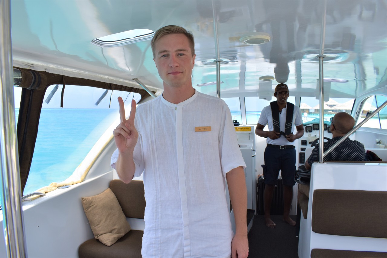 4名のスタッフにお迎えいただき、リゾート内へ。こちらは、バトラーのAnton。何から何までお世話になって。。。彼無しではここのリゾートを満喫できなかったと思います。本当にナイスガイでした。このお写真は、最後に撮影させていただいたもの。まさか初めからピースはしません^^