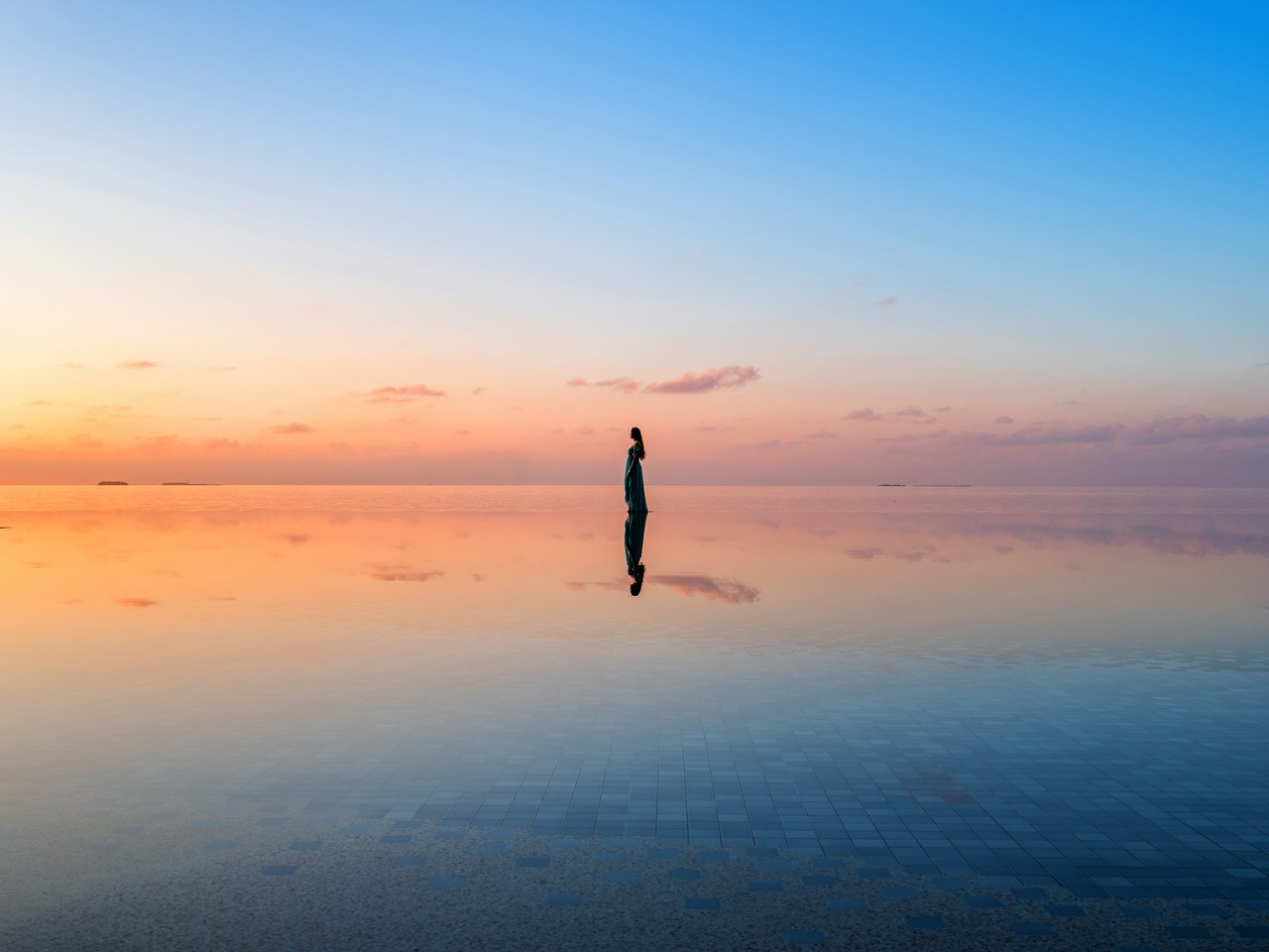 話は戻りますが、このパブリックプールでのサンセットを見逃してしまったのが唯一の心残りです。こちらは公式HPからお借りしたものですが、こんな幻想的なシーンに遭遇できるんですね。 サンセットの後は、LEDライトでライトアップされた星空のようなプールを見ることもできたようです。。。インスタで見て(→こんな感じ)、後で知りました…