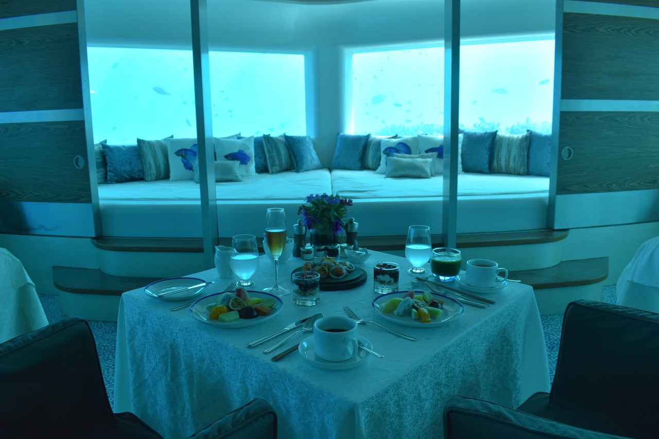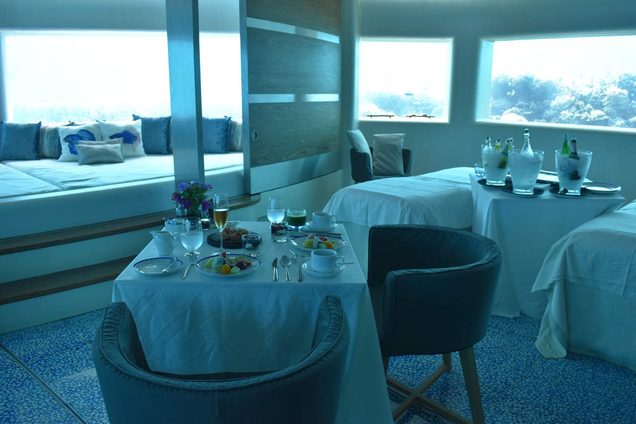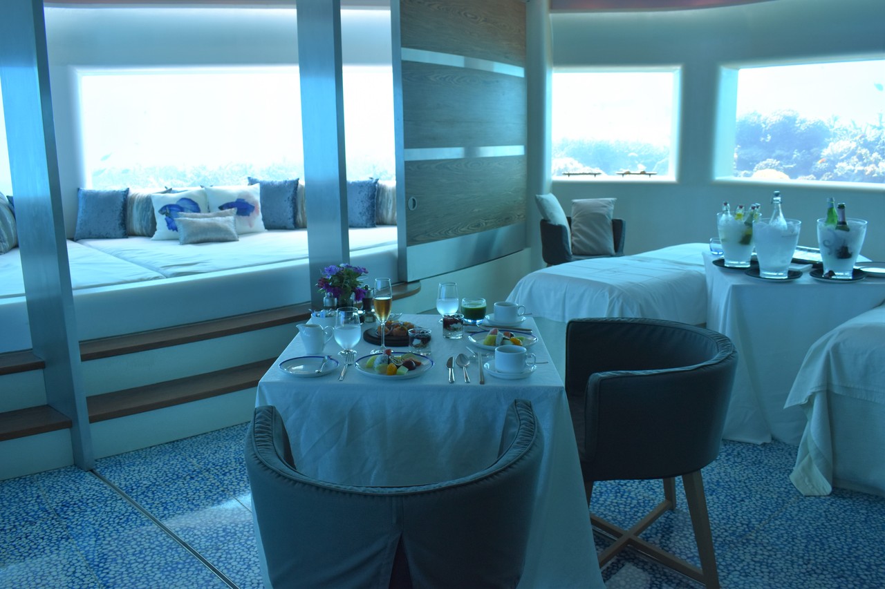 先日、フヴァフェンフシの海中スパに恋焦がれていたことを書きましたが、まさか、その海中スパで、朝食がいただけるだなんて…! フヴァフェンフシが海中スパをオープンして以来、モルディブのいくつかのリゾートは、海中にレストランをオープンしましたよね。一番有名なのは、コンラッドでしょうか。 でも、ここはレストランではなくスパでござんす。 スパ好きの私としては、海中レストランではなく、海中スパでお食事がいただける、ということの方が、より特別感があって、興奮します。