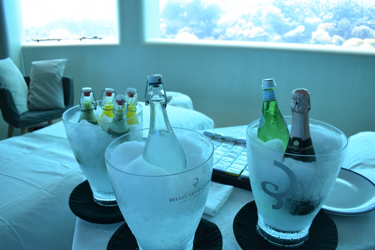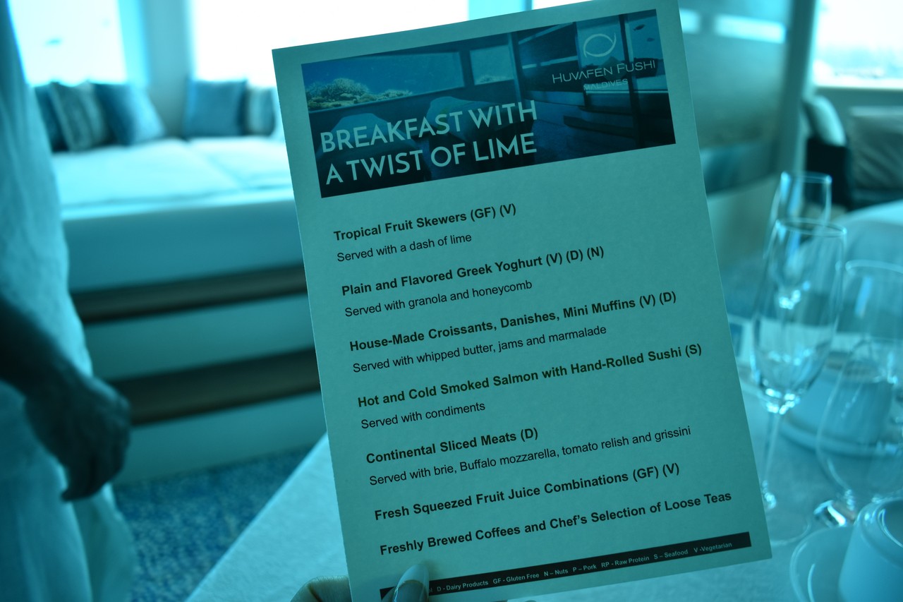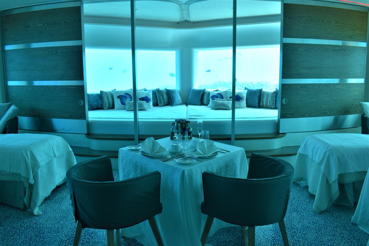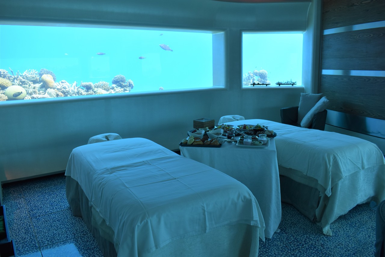 先日、フヴァフェンフシの海中スパに恋焦がれていたことを書きましたが、まさか、その海中スパで、朝食がいただけるだなんて…! フヴァフェンフシが海中スパをオープンして以来、モルディブのいくつかのリゾートは、海中にレストランをオープンしましたよね。一番有名なのは、コンラッドでしょうか。 でも、ここはレストランではなくスパでござんす。 スパ好きの私としては、海中レストランではなく、海中スパでお食事がいただける、ということの方が、より特別感があって、興奮します。