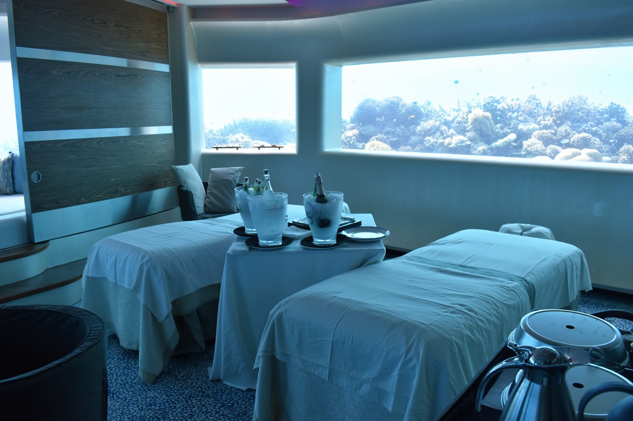 そうなんです、スパのことを書いたブログで、全体のお写真をアップしていませんでしたが、海中トリートメントルームは、中央を仕切ると2室に分かれるようになっていて、間の中央にデイベッドが備わっているんです。でも、よほどのことがない限りは、2人でのトリートメントの際は、貸切になるとおっしゃっていました。