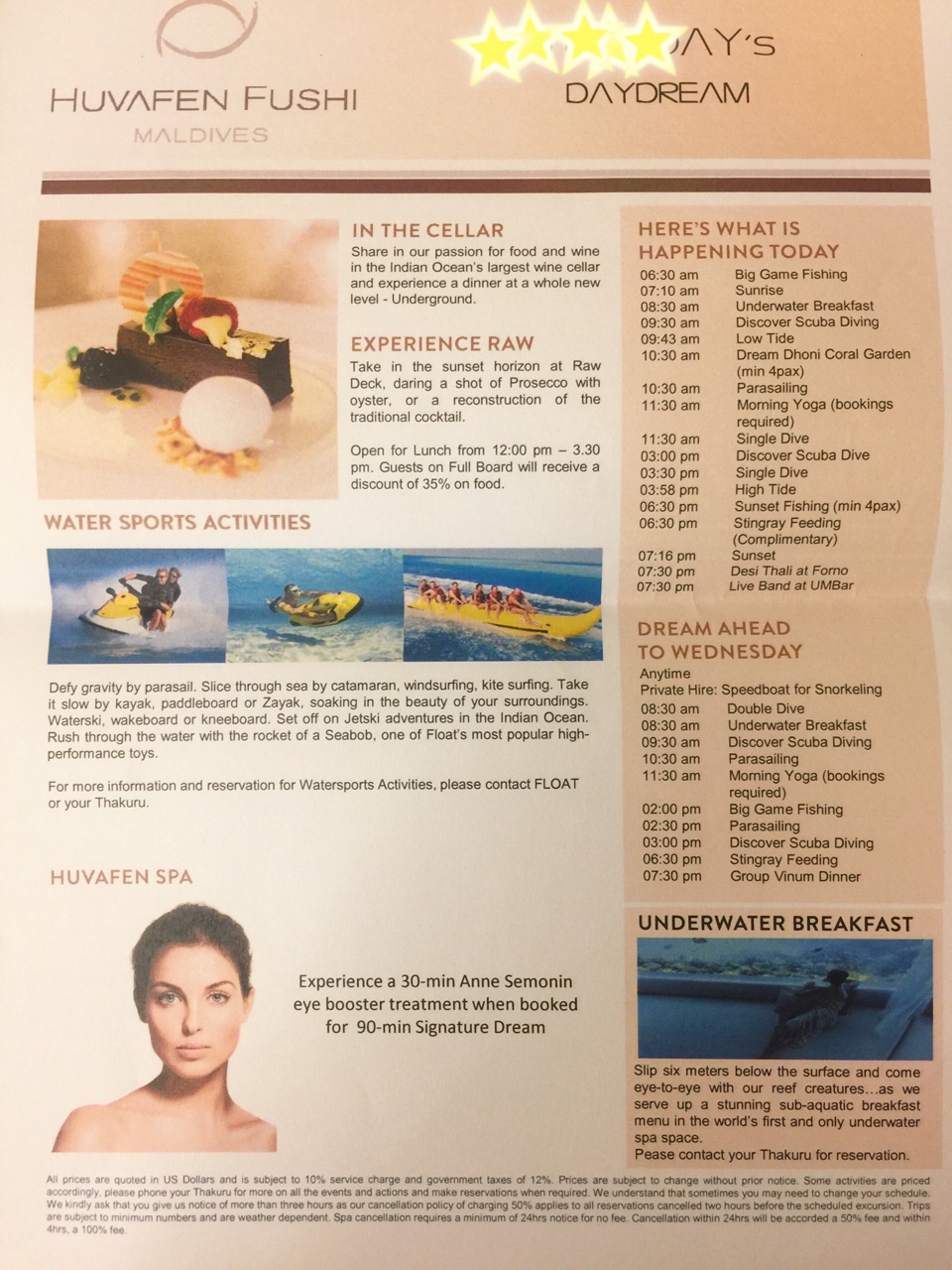 こんな形で、毎日夜に、翌日のリゾート内アクティビティのスケジュールが届きますが、「UNDERWATER BREAKFAST」の文字に釘付けです^^