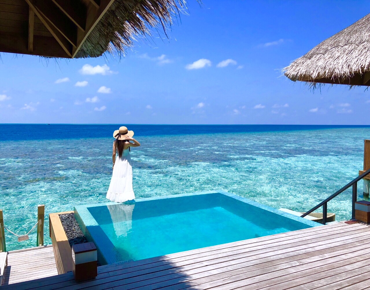 インフィニティプールの上に立つこのショット、一度してみたかった! 足がプルプル震えて、ぎこちないんですけど、すごく満足しました。