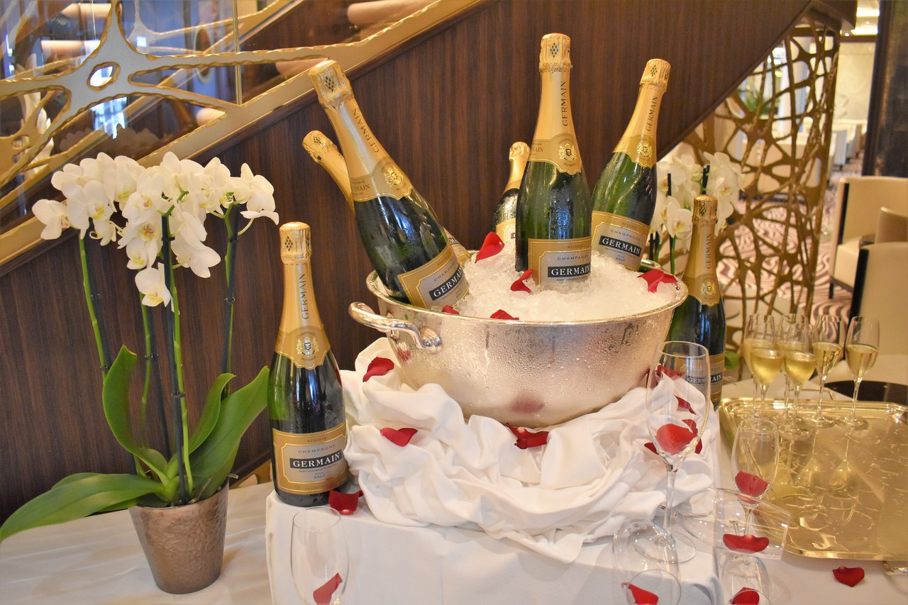 ウエルカムシャンパンは、全ての客室に用意されていまして、さらに、なくなると、ボトルでのオーダーも可能です。この船、呑兵衛には危険です^^