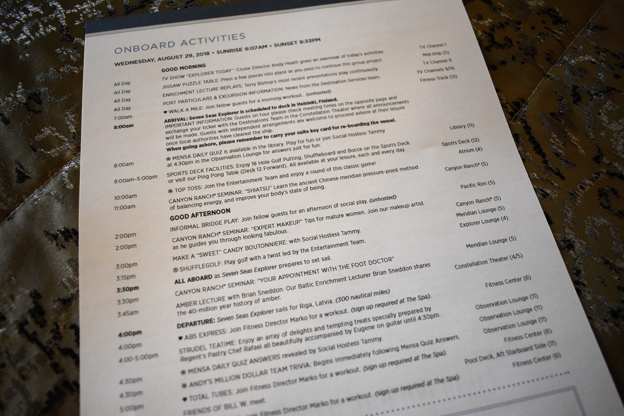 毎日夜に配られる、船内新聞’’PASSAGES''には、各場所でのアクティビティが詳細に書かれています。