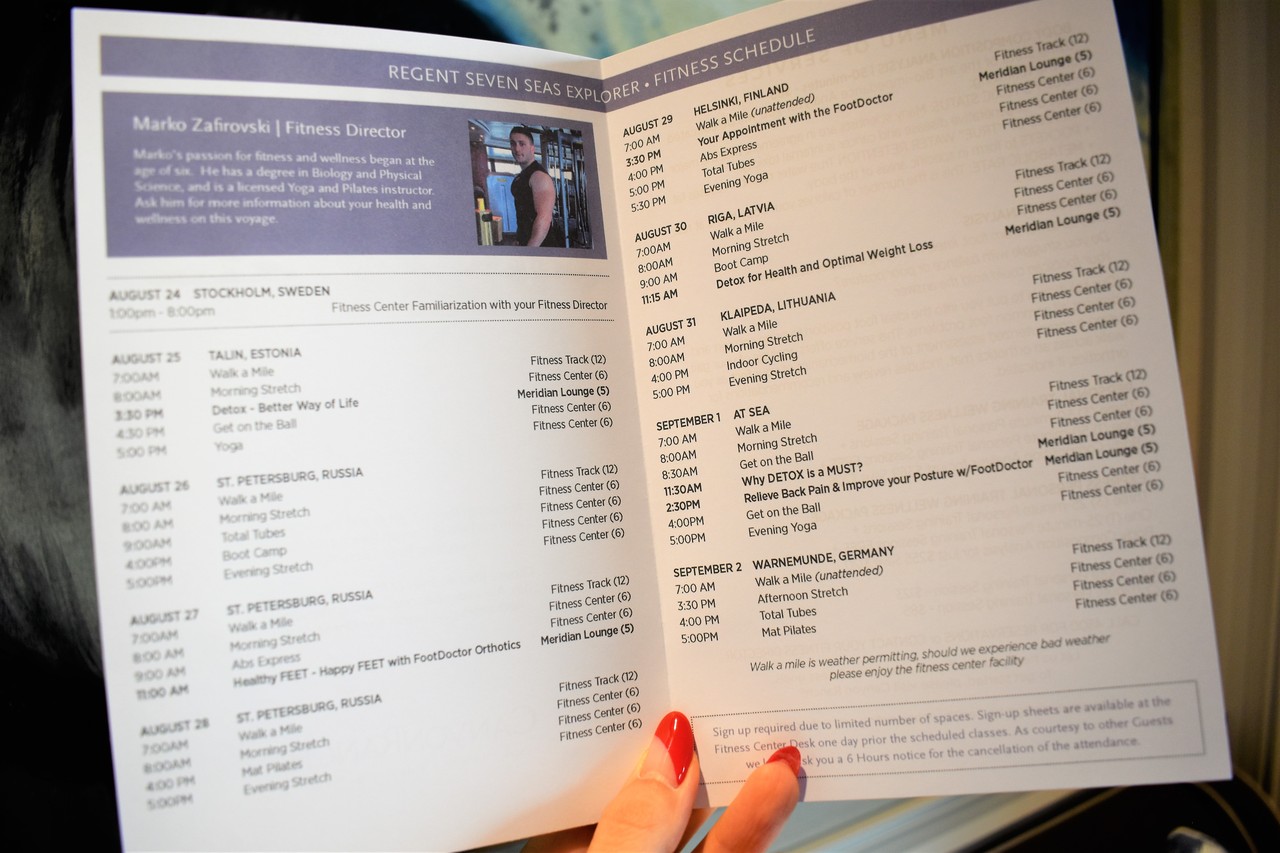 16時半に、避難訓練が行われるというので、それまでパンフレットや資料を見ながらお部屋でゆっくり。 こちらは、滞在中のジムでのプログラム。マンツーマンレッスン以外は、もちろん無料で参加できます。