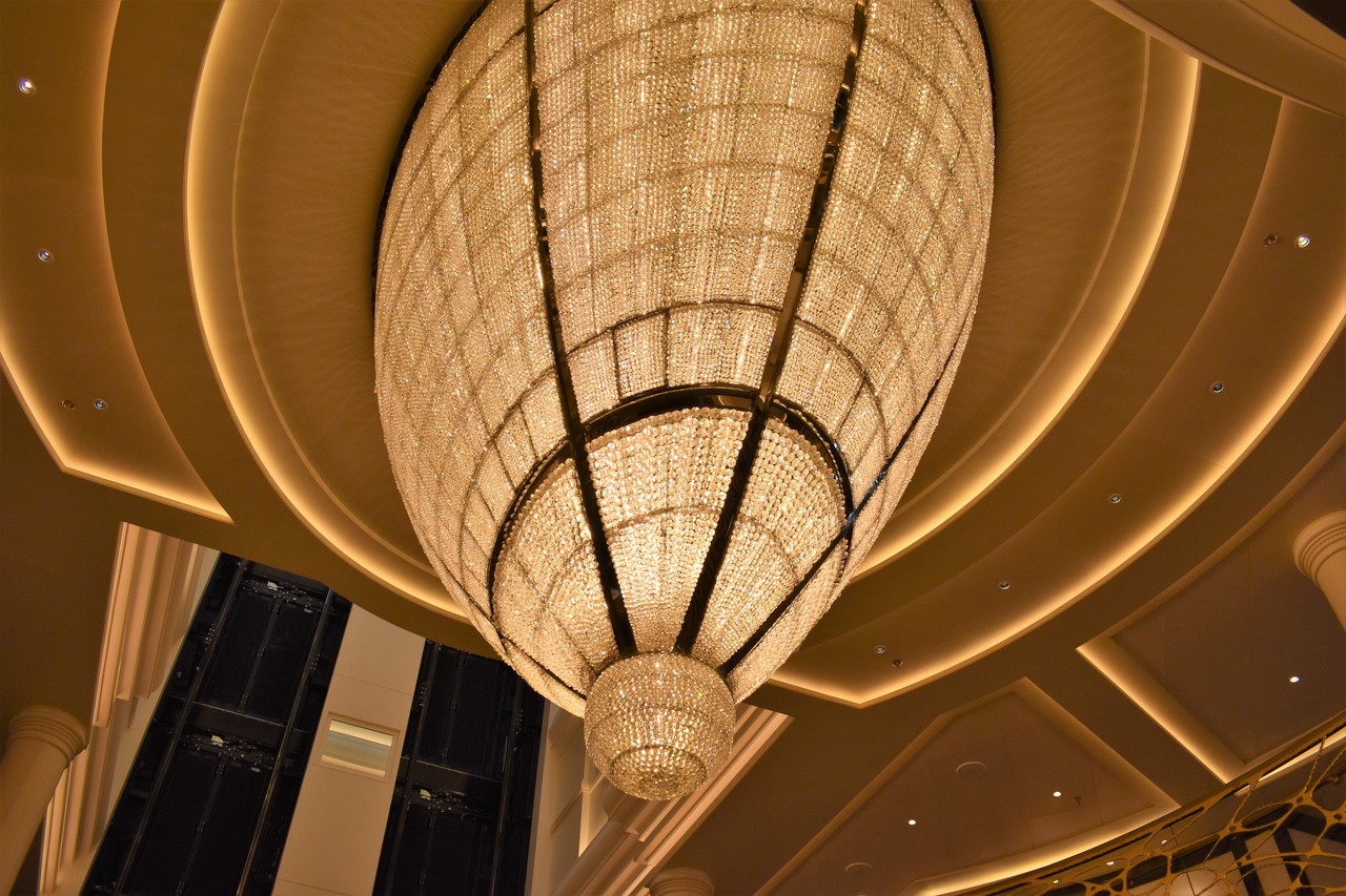 豪華絢爛な吹き抜けのロビーは圧巻。このシャンデリアだけでも、2〜3mありそうです。