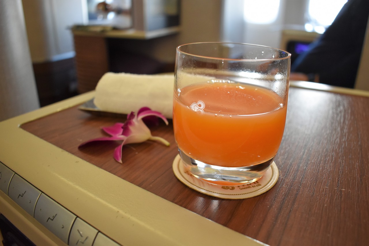 ウエルカムドリンク。トレイの上にシャンパンの選択がなかったので、怪しい飲み物を取ってみました。オレンジジュースと言っていたけれど‥‥とても甘い何かです。