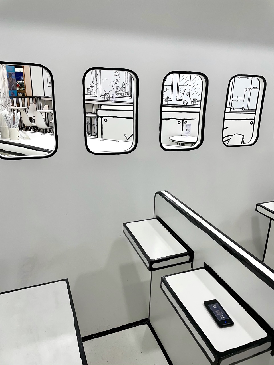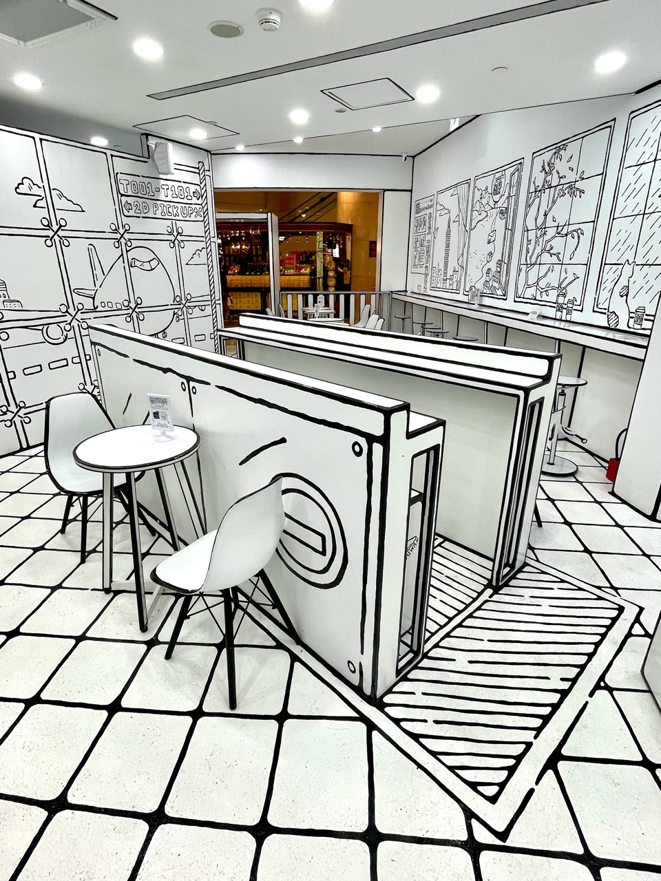 おーー、これが二次元カフェというものですか。どこから見ても平面に見えるようになっているのですね。 漫画の世界に入り込んだような気持ちになりました。