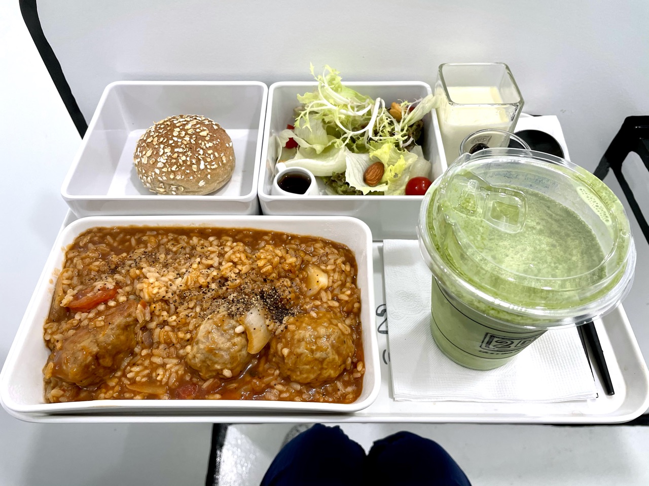 このリゾット、ある…! ミートボールがゴロッと入っていて、まさにこんな感じの機内食ありますよね。 しかも、なかなかのお味で、悪くないです。少しピリ辛で、クセになります。