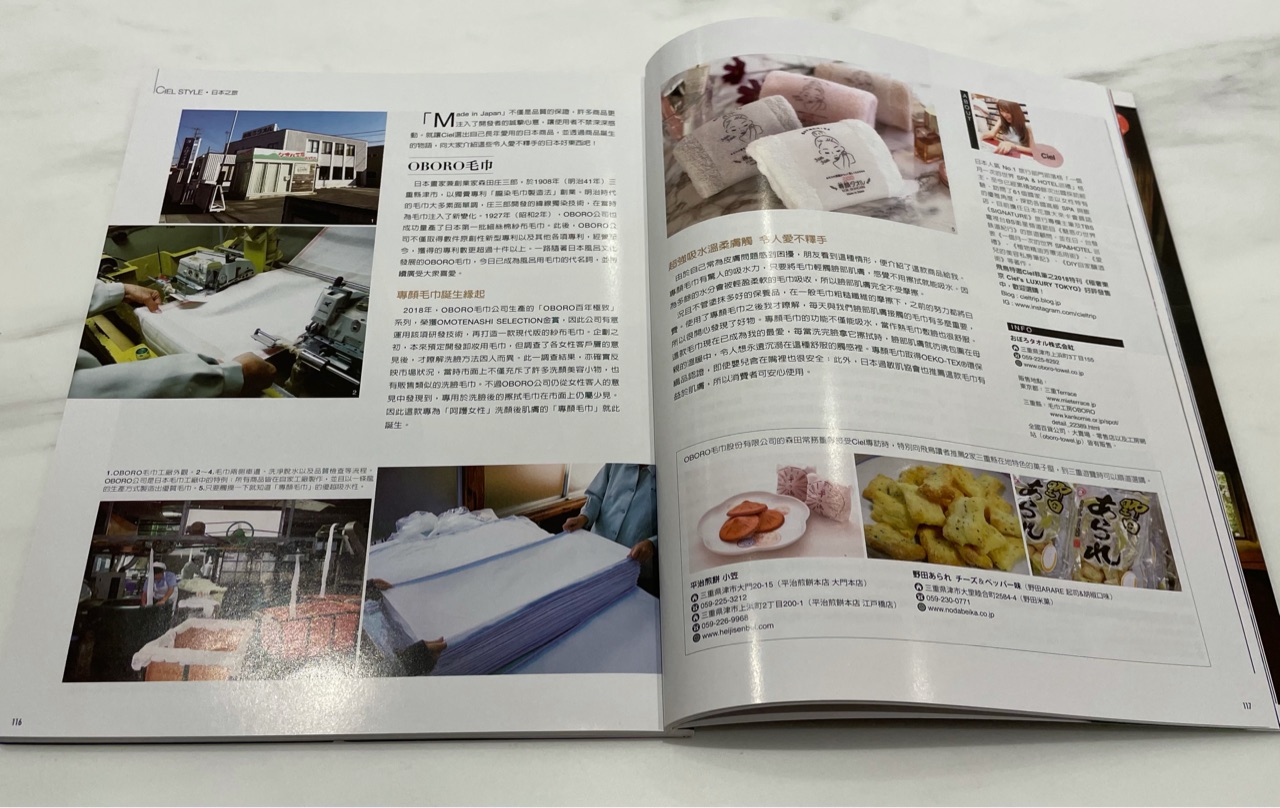 昨年、台湾の雑誌で、“Made in Japanのお気に入りグッズ”をご紹介させていただいたのですか、その誌面でも、おぼろタオルを愛用品としてご紹介させていただきました。せっかく自分の好きなものを台湾の皆様にご紹介する機会をいただけたので、タオルの使い心地や愛用している理由だけでなく、おぼろタオルの会社の歴史や開発エピソード、製造工程など、もっと詳しくお伝えできたらと思い、おぼろタオルさんに資料のご提供やアンケート取材のご協力をお願いしました。