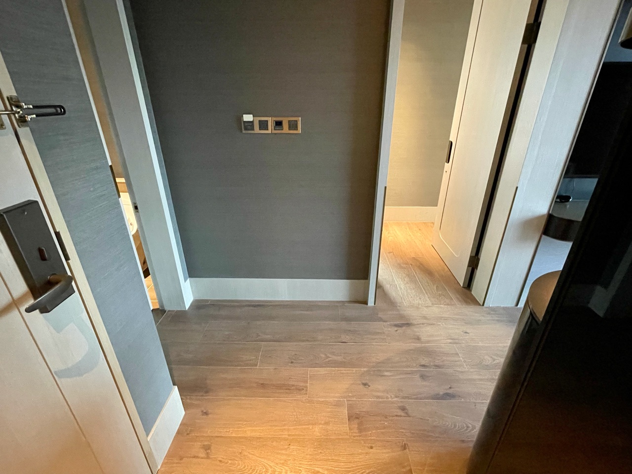 バスルームの前に、けっこう広めのスペースがあります。ここは少し勿体ないなぁと思いました。本来何か置く場所だったのかな。 あ、思い出した。全身鏡がなかったのでした。ここの壁の前にあったら嬉しかったかなと思ったのでした。