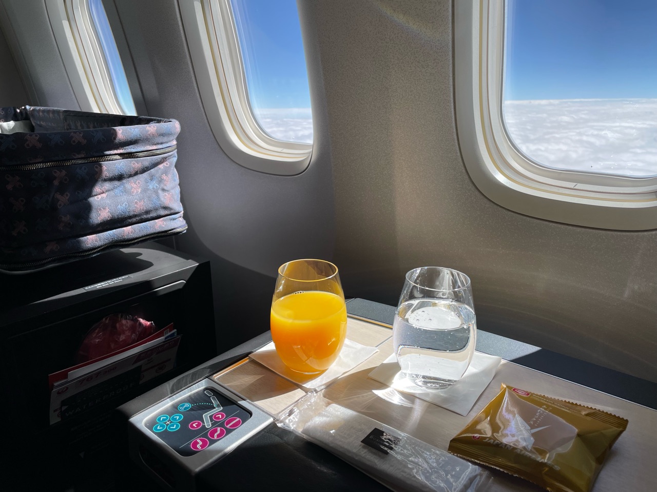 バシネットに入ってくれたのは10分くらいと、ほぼほぼ抱っこしていて、機内を楽しむという余裕はなかったのですが、それでも窓から覗き込む真っ青な青空が綺麗で、またしても涙が込み上げてきそうでした。