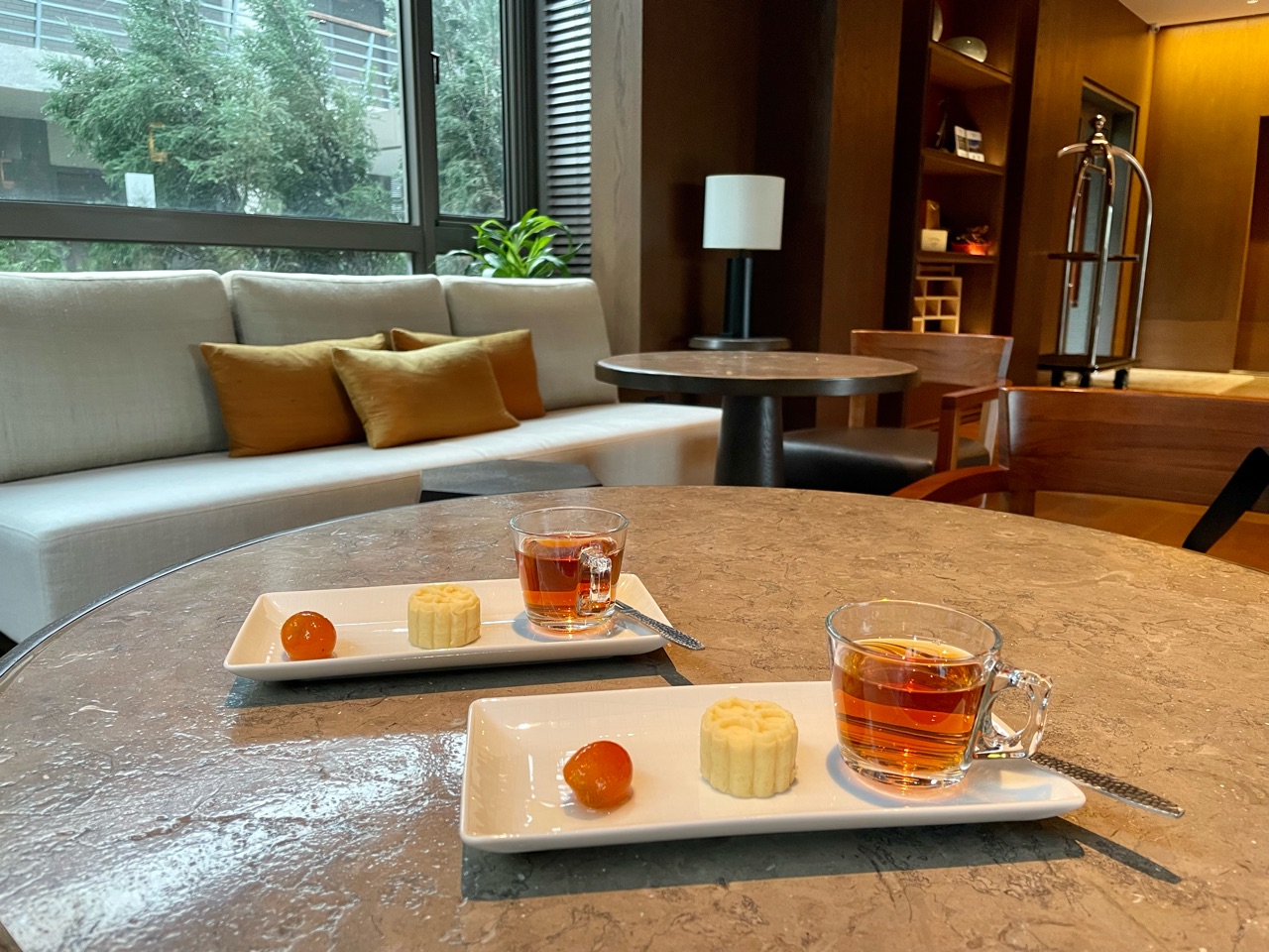 ウェルカムティーもウェルカムスイーツの金柑のシロップ漬け、緑豆糕も地元宜蘭のものです。