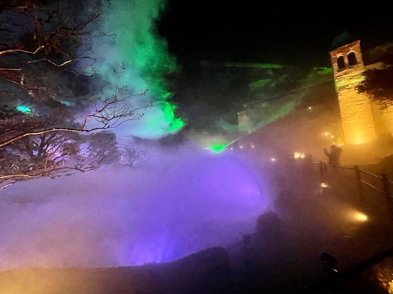 最後は、霧(ミスト)で目の前が見えなくなる中、少しずつそれが無くなっていき、視界がクリアになり、ライトアップされた紅葉が見えてくるという。とても幻想的でした。