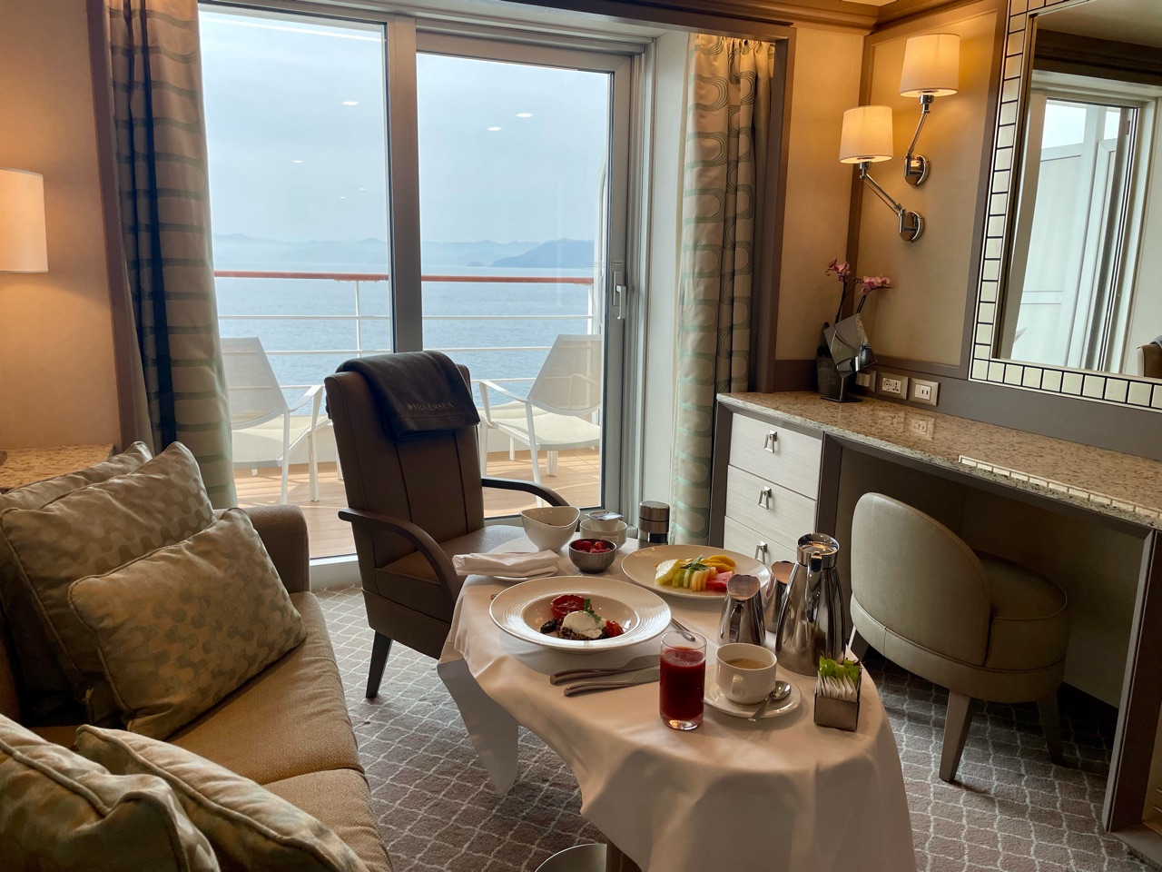 バトラーサービスのあるホテルに滞在しても、あまり利用せずに滞在を終えることが多いですが、船旅となると話は別。朝の珈琲から始まって、レストランの予約に、ルームサービスの手配など、このバトラーのきめ細やかなサービスが、船旅をより楽しく快適にしてくれます。