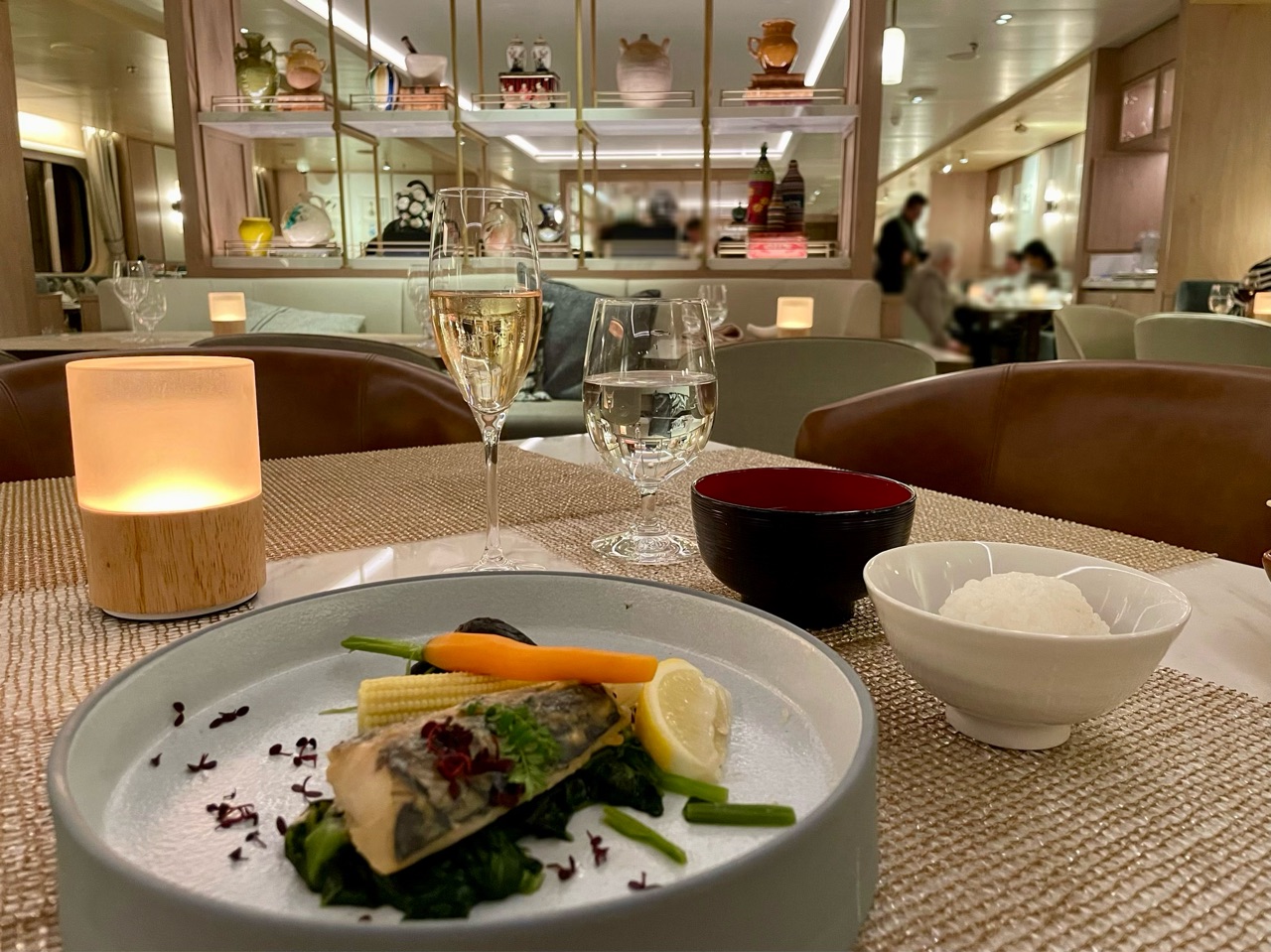 6つのレストランの一つには、7年連続ミシュラン一つ星を獲得している「鈴なり」のレストランがあります。 これは、通常のシルバーシーでは提供されません。ジャパネットがチャーターをした、この期間だけのスペシャルレストランで、実際に、鈴なりの村田シェフが乗船され、直々に料理を振舞われていました。