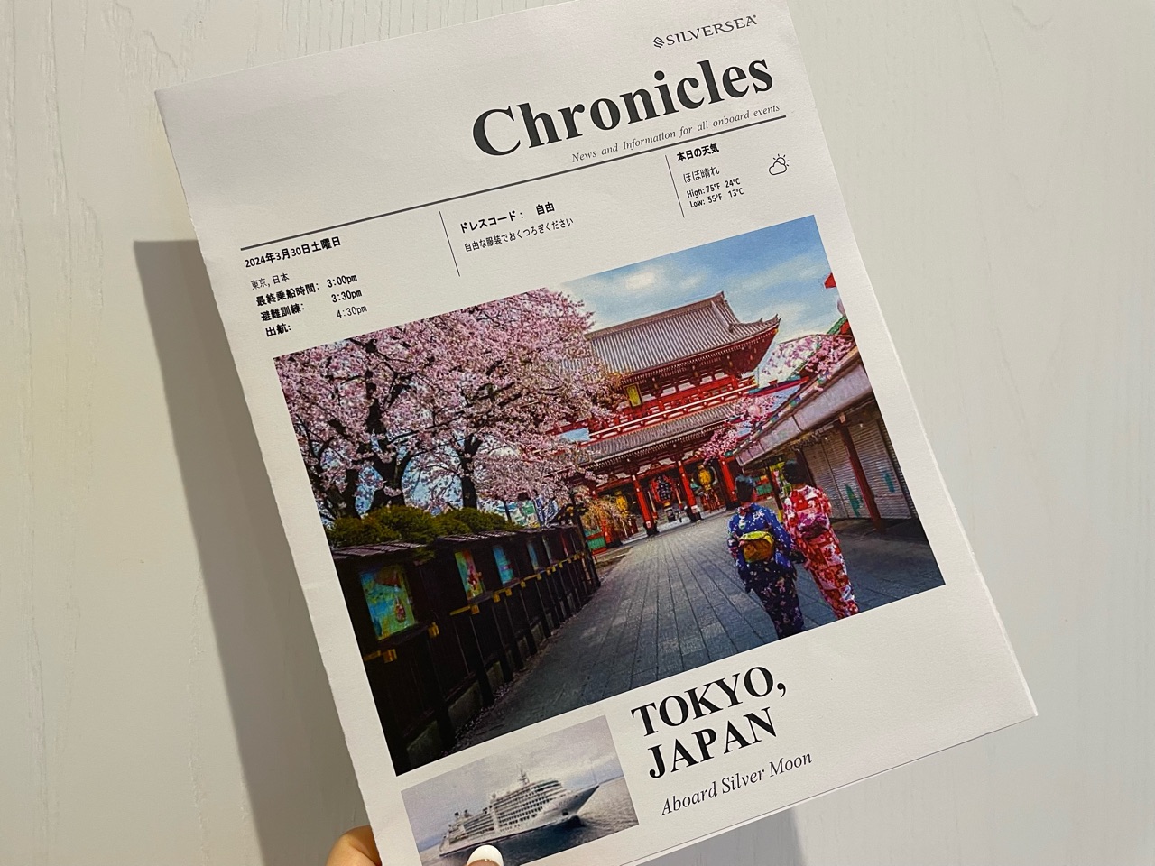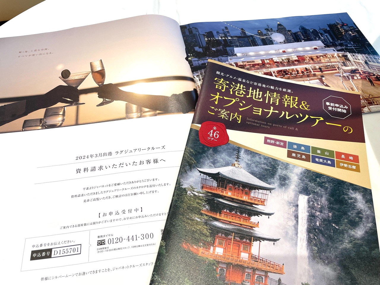 今回、乗船させていただいたクルーズは、「陽春の日本絶景ツアー」として、熊野/新宮(和歌山)・徳島・釜山(韓国)・長崎・鹿児島・奄美大島・伊勢志摩(三重)の7都市を巡ります。 こちらは、事前にいただいた、シルバーシー船内についての資料や、寄港地情報&オプショナルツアーのご案内。