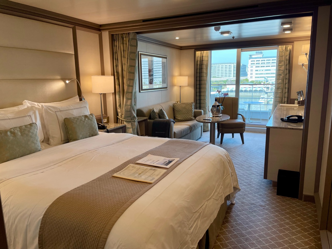 シルバーシーは、モナコに本社を置くラグジュアリークルーズブランドです。全客室が海側、バスタブ付き、ベランダ付きスイート仕様、そして、全客室にバトラーサービスが導入されています。そのシルバーシーから2020年8月にデビューし、最新の設備を搭載した新造船が、今回乗船したシルバー・ムーンになります。