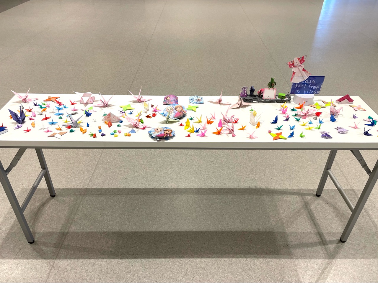 チェックインとセキュリティ審査を終え、クルーズ船のエントランスに向かいます。途中にクルーが手作りされた折り紙作品が展示されていました。よろしければ、お好きなものをお部屋にどうぞ、ということでしたが、ひとまず記念撮影を。