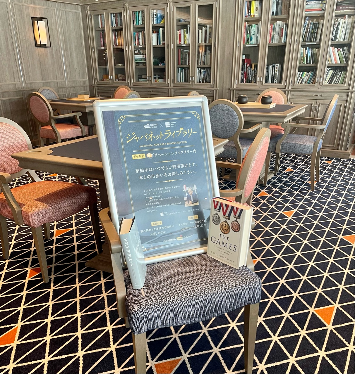 11階にあるライブラリー内には、青山ブックセンターが、ジャパネットクルーズのために選書した約1000冊の日本の書籍が用意されていました。