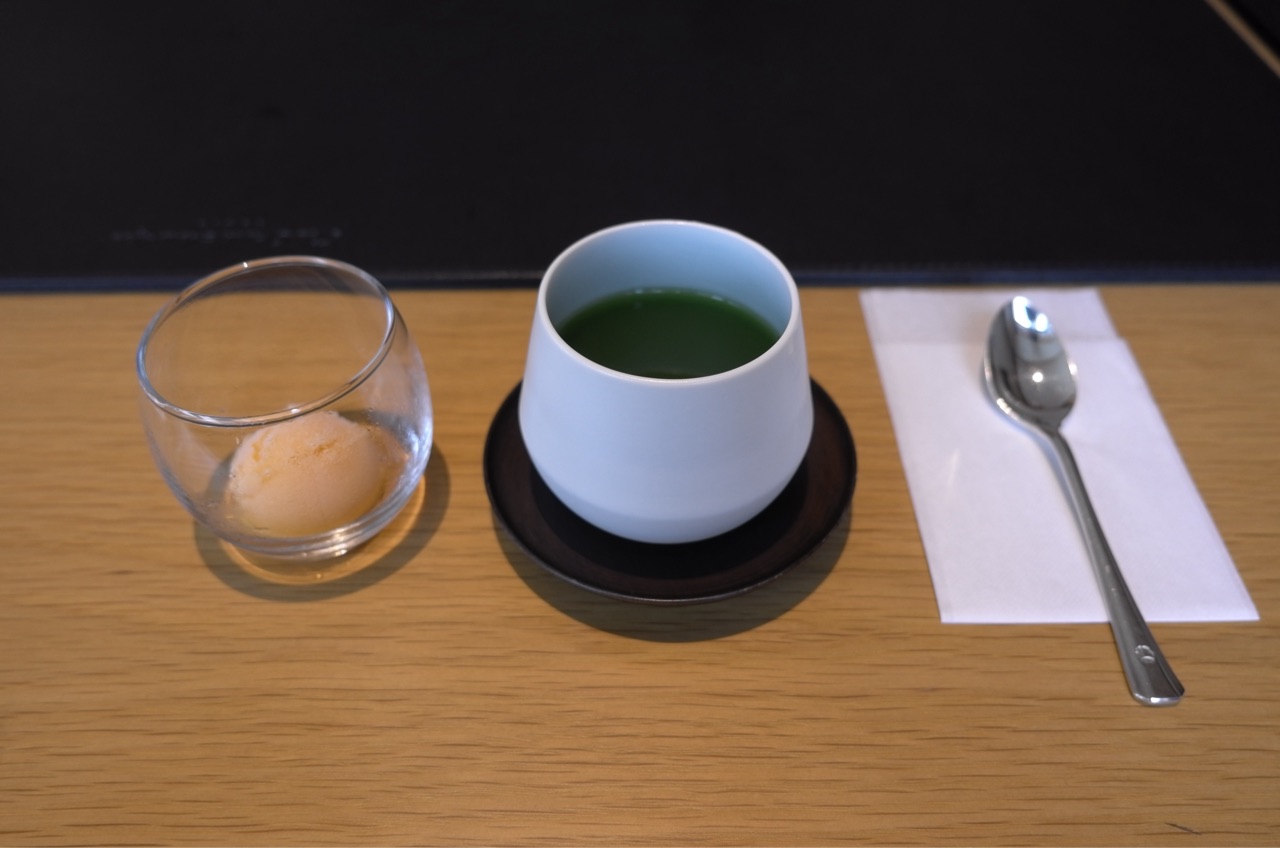 お抹茶とアプリコットのシャーベット。 シャーベットが体に染み渡ります。