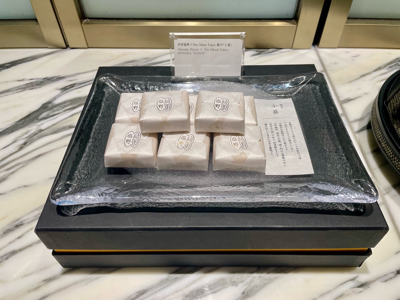 赤坂塩野 × The Okura Tokyo 最中。こちらも館内で販売されているもの。先ほどの食パンもそうですが、ここでお試しして美味しかったら購入できるっていうの、いいですよね。