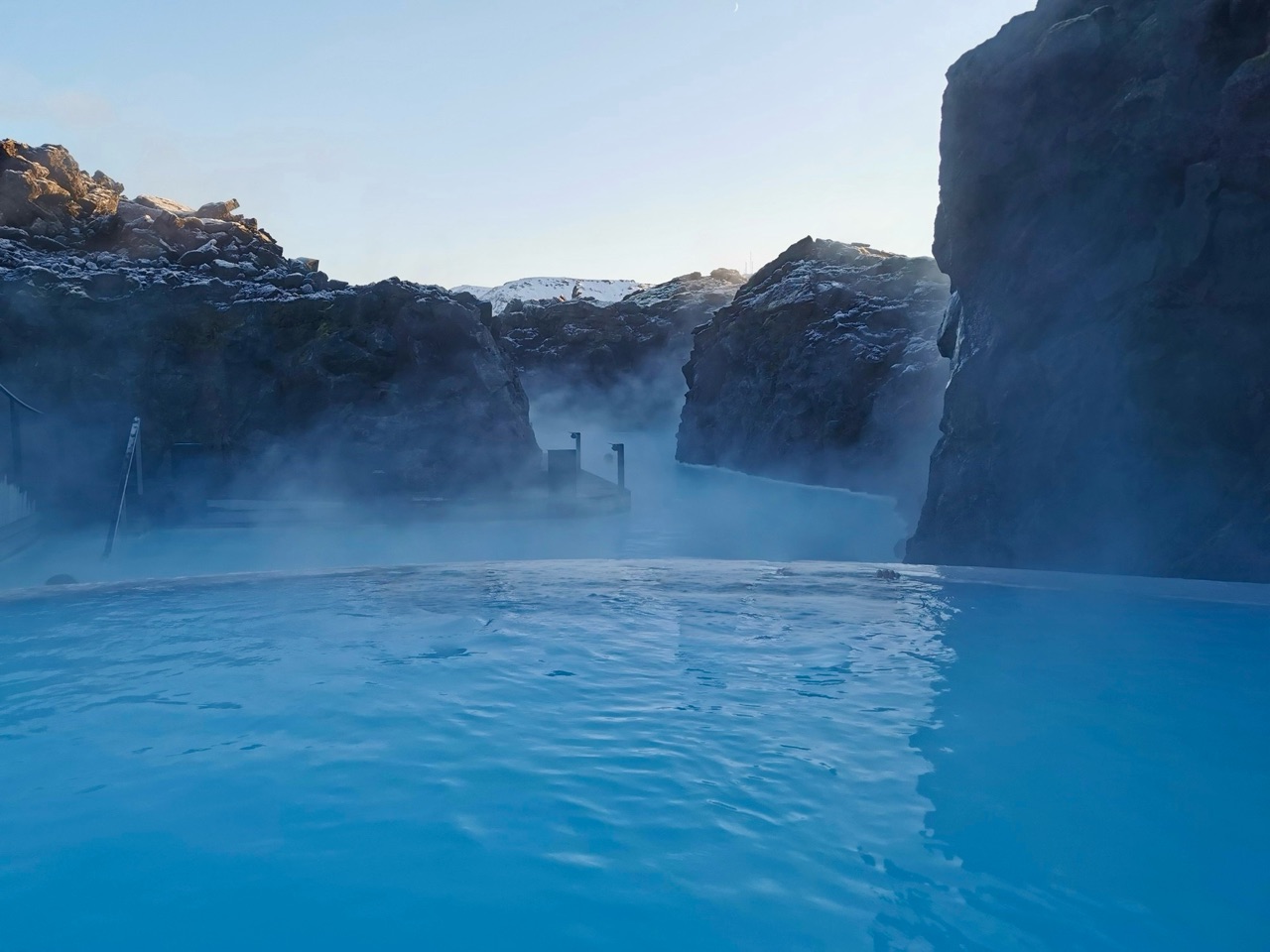 ミルキーブルーの温泉に、岩壁に囲まれた空間は、非日常感たっぷり😊