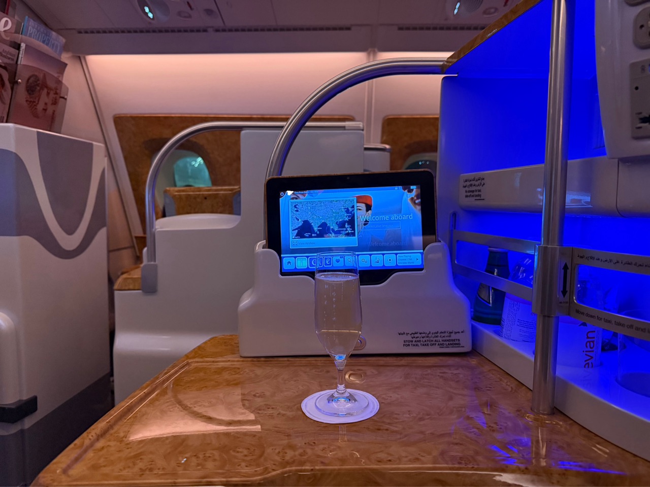 ウェルカムシャンパン。深夜便でも飲む気満々。