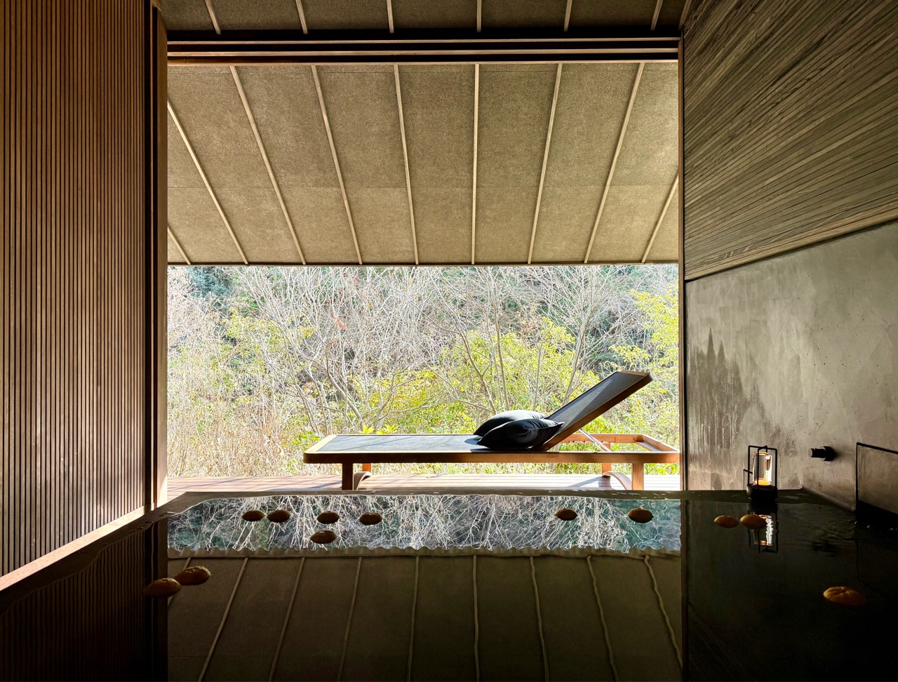 ずっと憧れのお部屋だったので、実際にご宿泊された方のブログや、ウェブマガジンなどを拝見しては、予習をしていました。笑 でも、そういう時って、悲しいかな。事前に頭の中に情報が入ってしまっているためか、憧れが強すぎる故にその画像が目に焼き付いてしまっているからか、訪れてみると、そこまでの感動がない、なんてことも実はあったりするのですが、でも、こちらは違いました。想像しているよりも遥かに素敵なお部屋で、特に、露天風呂からの景色が素晴らしく、温泉の目の前にプールがあり、その隣に水盤が広がるという、あまりにも贅沢な空間過ぎて、この世にいるとは思えず。ビルに囲まれた場所に住んでいる日常とはかけ離れた、大自然の絶景を目の前に、たっぷりと非日常の時間を楽しめました。立ち湯っていうのがまた味があっていいんですよね。